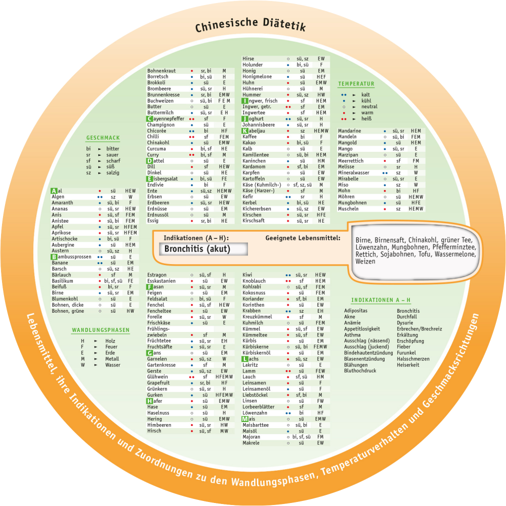 Beispiel: Welche Lebensmittel sind bei Bronchitis (akut) geeignet? Sie drehen die Scheibe auf Bronchitis und finden in dem rechten Fenster die Lebensmittel Birne, Chinakohl, Tofu usw. Nähere Angaben wie Geschmack, Wandlungsphase oder Temperaturverhalten finden Sie ebenfalls auf der Scheibe. Wenn der Patient Tofu nicht verträgt oder mag, suchen Sie ein vergleichbares Lebensmittel mit ähnlichem Temperaturverhalten (hier kühl und süß). Eine Liste mit den Indikationen ist ebenfalls auf der Scheibe vermerkt.